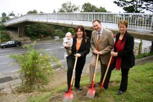 Bald können Fußgänger den Flötzersteig zwischen dem 14. und 16.Bezirk leichter queren. Der Flötzersteigsteg, eine wichtige Verbindung für Fußgänger am stark befahrenen Flötzersteig, wird umgebaut und erhält eine behindertengerechte Anbindung. Am Montag erfolgte der Spatenstich durch die Bezirksvorsteherin des 14. Bezirks, Andrea Kalchbrenner, SP, dem Bezirksvorsteher des 16. Bezirks, Franz Prokop, SP, und Frau Elisabeth Kolb, die mit ihrer Idee den Anstoß zum Neubau der Rampe gegeben hat. Die Arbeiten werden voraussichtlich bis Jänner 2006 dauern... |